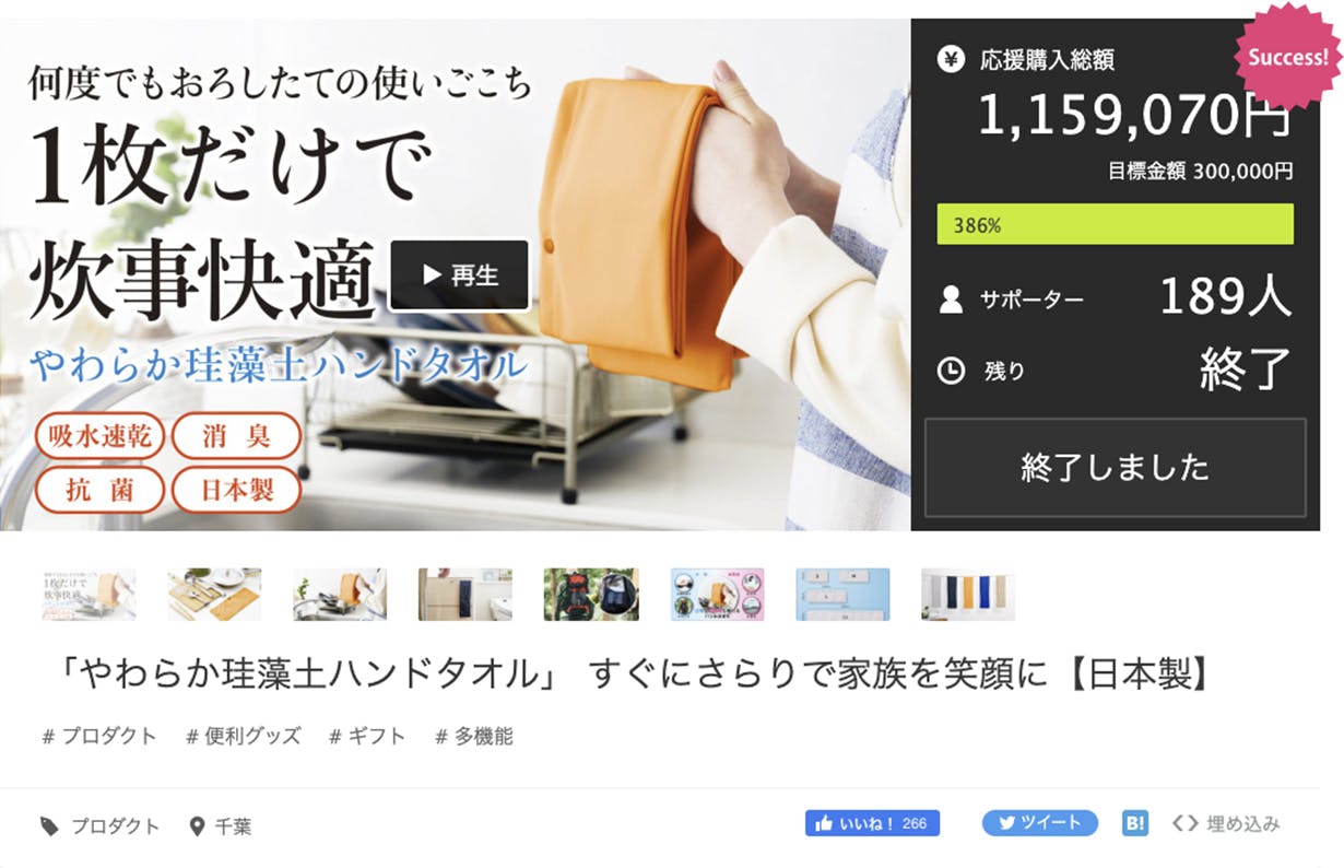 国内クラウドファンディングで実施した第一弾のプロジェクトでは目標金額の386%を達成、189名様もの多くの方々にご支援いただきました。誠にありがとうございます。