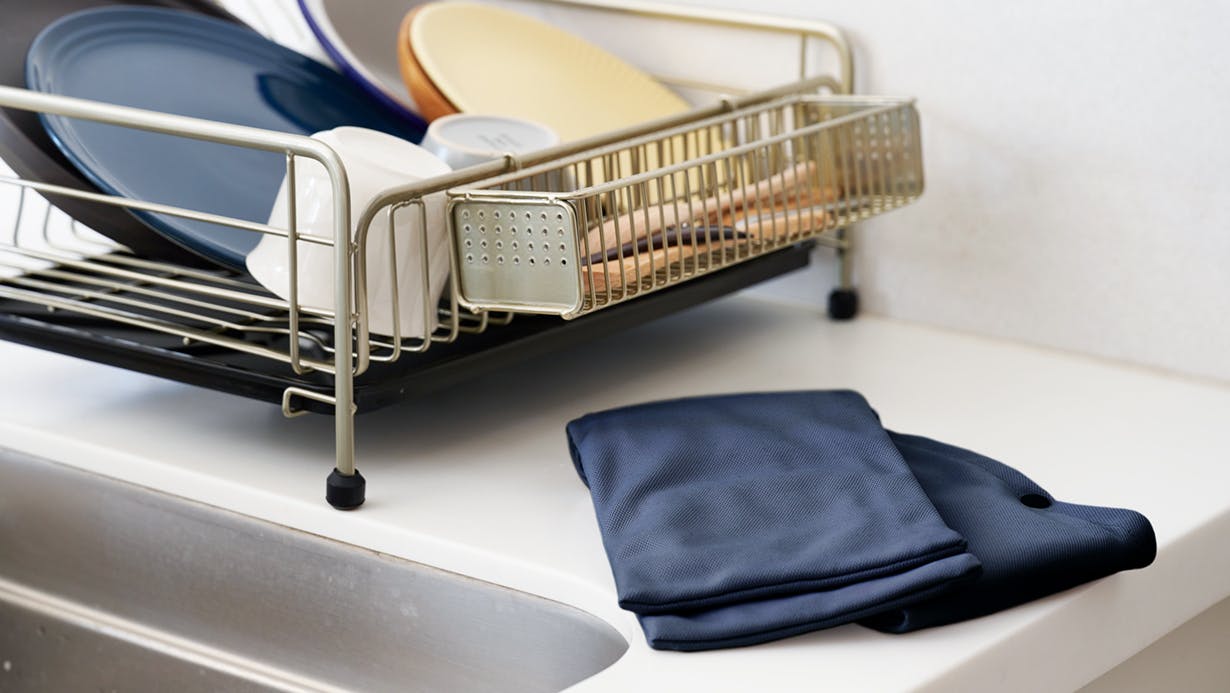 幅を細身にすることで、タオルラックに掛けやすくしました。無地でシンプルなデザインのため、どんなキッチンにも馴染みます。