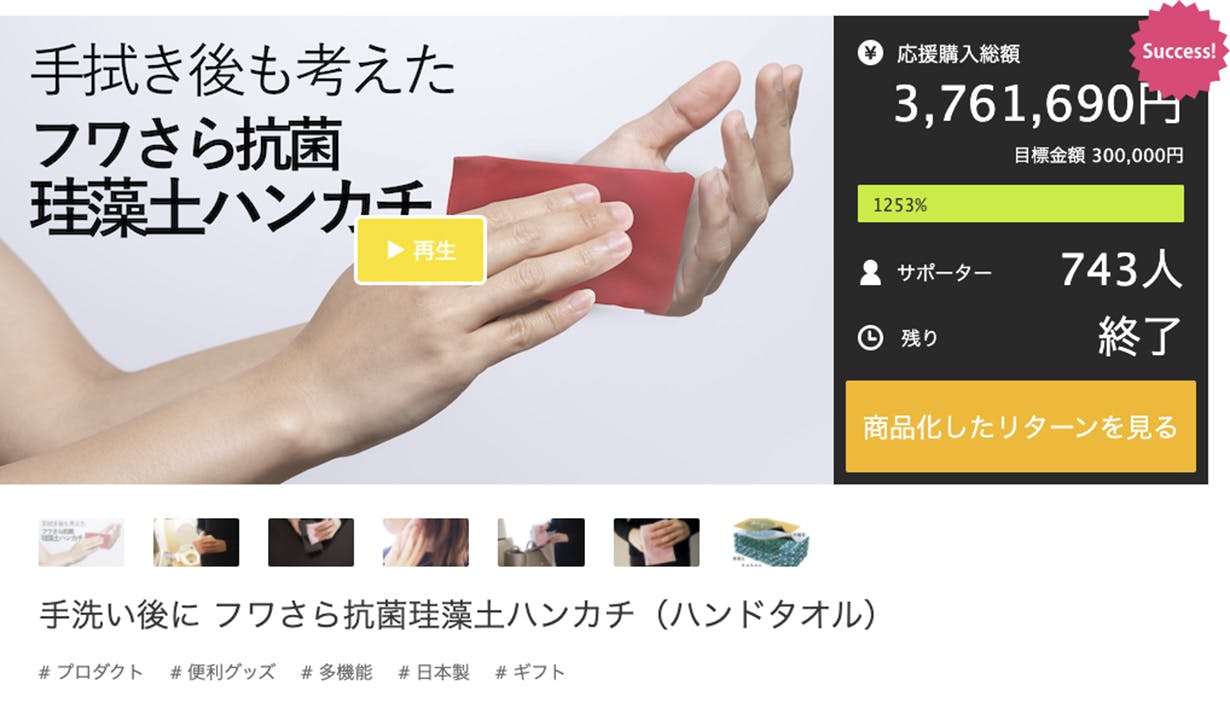 初代製品は新型コロナ予防を考え、外での手洗い時を快適にする製品として珪藻土ハンカチを開発。2020年3月に応援購入プロジェクトを実施しました。