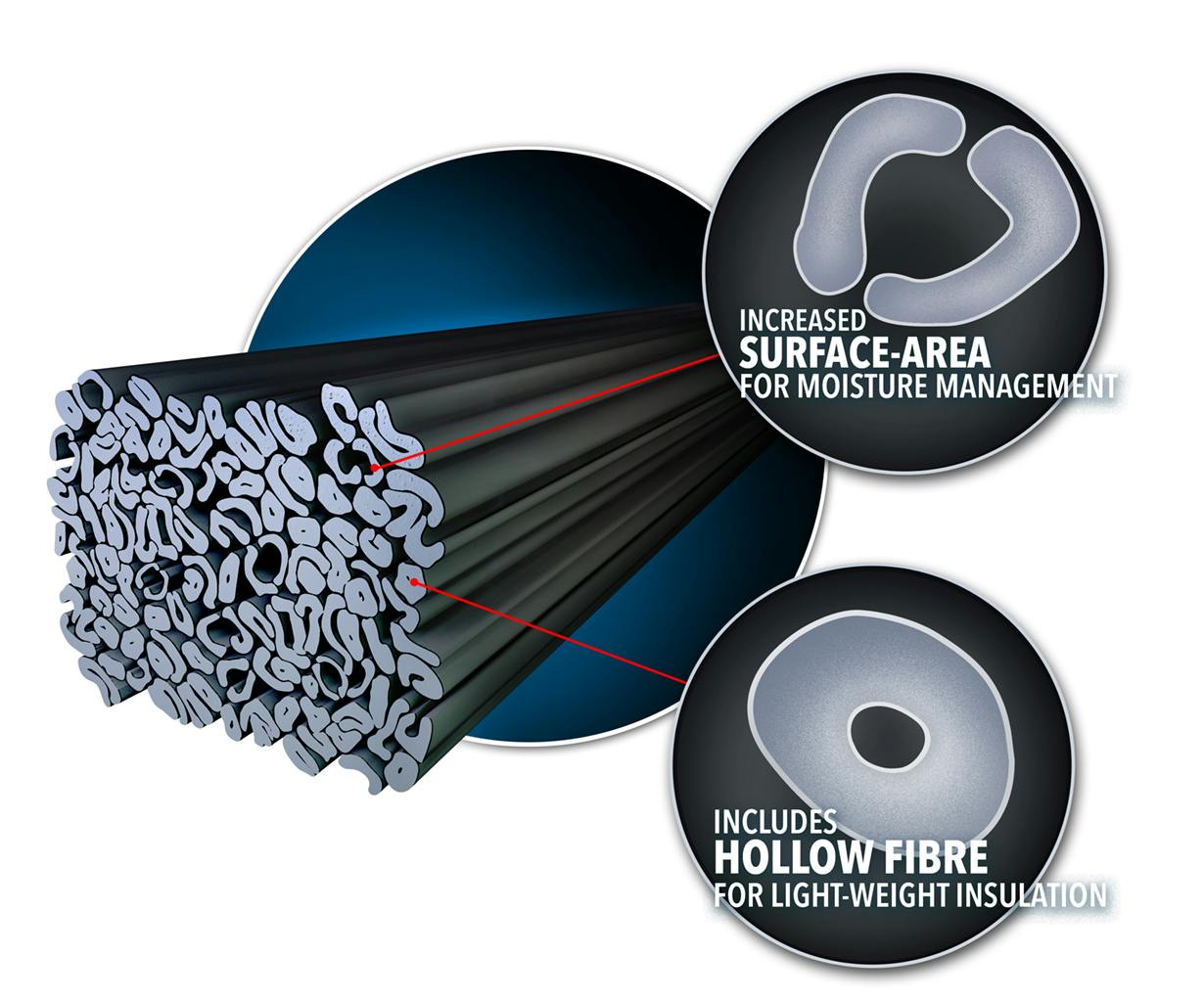 COOLMAX®️EcoMade Fabric は、1本の繊維の中に4つの溝を持つポリエステル製の異型断面繊維です。通常の繊維と比べてその表面積が大きいため、湿気の蒸発が早くなります。また毛細管現象が起きやすく、内側の水分や湿気を素早く蒸散します。