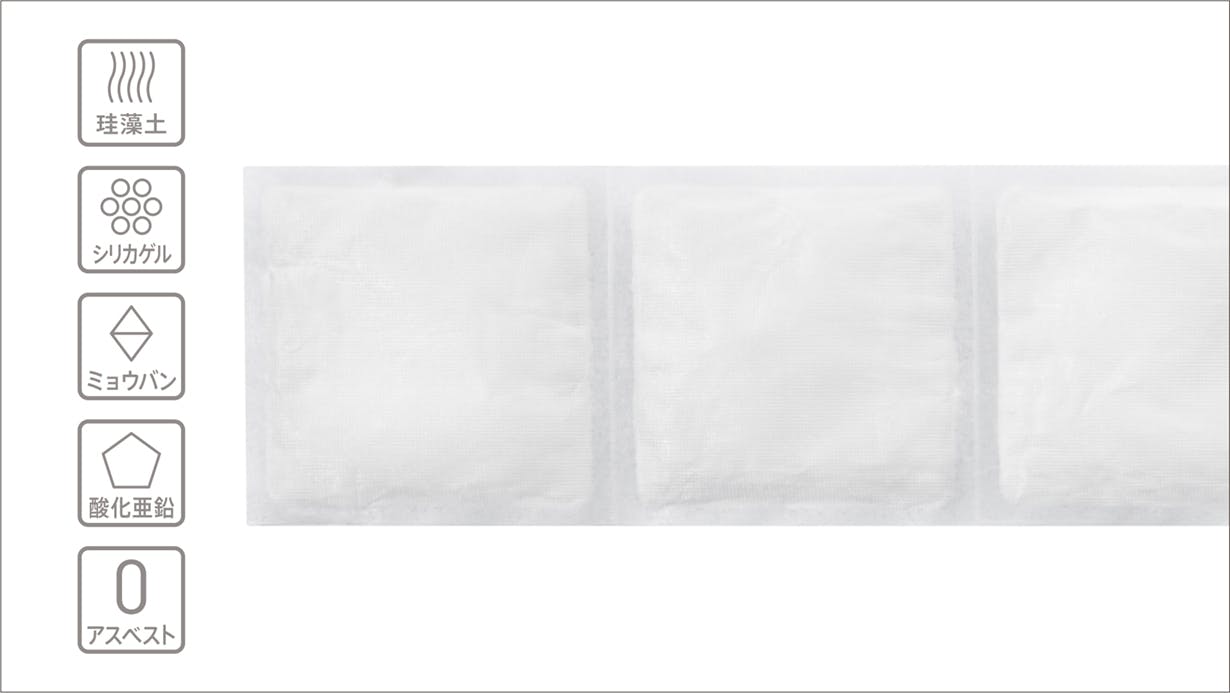 内部では珪藻土とシリカゲルが水分をしっかり吸収。粉体のまま封入することで、その表面積がそのまま吸水性能となり薄くても多くの水分を吸いとります。